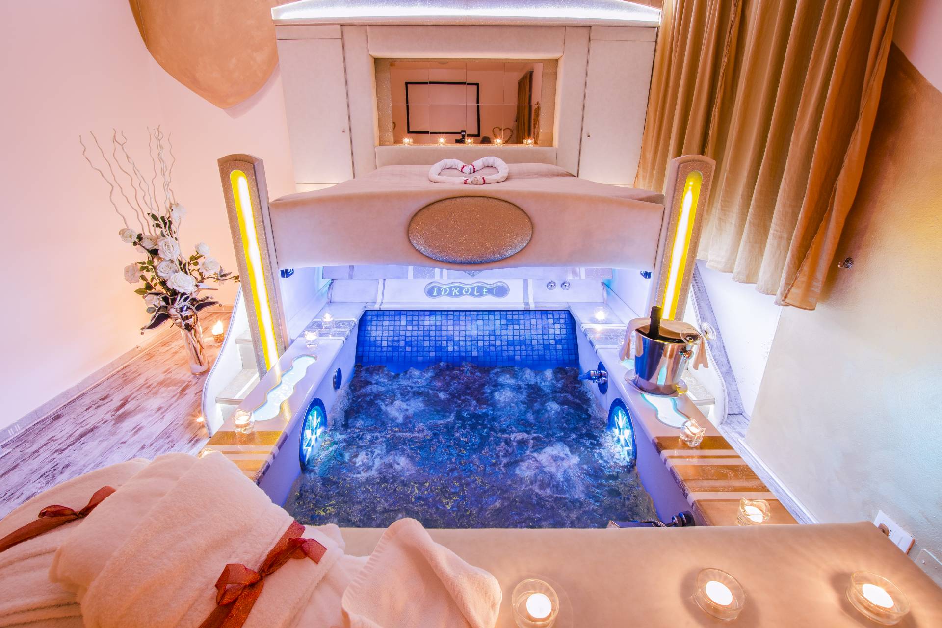 Ogni Suite ha un’ambientazione romantica esclusiva e presenta al suo interno una vasca idromassaggio privata estraibile da sotto il letto, brevettata per il benessere della coppia. Inoltre, potrete scegliere la suite con sauna, oppure con gazebo romantici, terrazza privata, cinema e area relax con frigo bar. Esperienza imperdibile è quella di cenare a lume di candela direttamente nella vostra in suite…