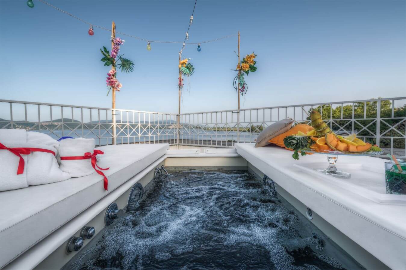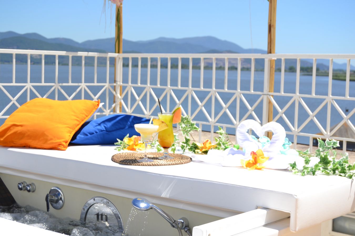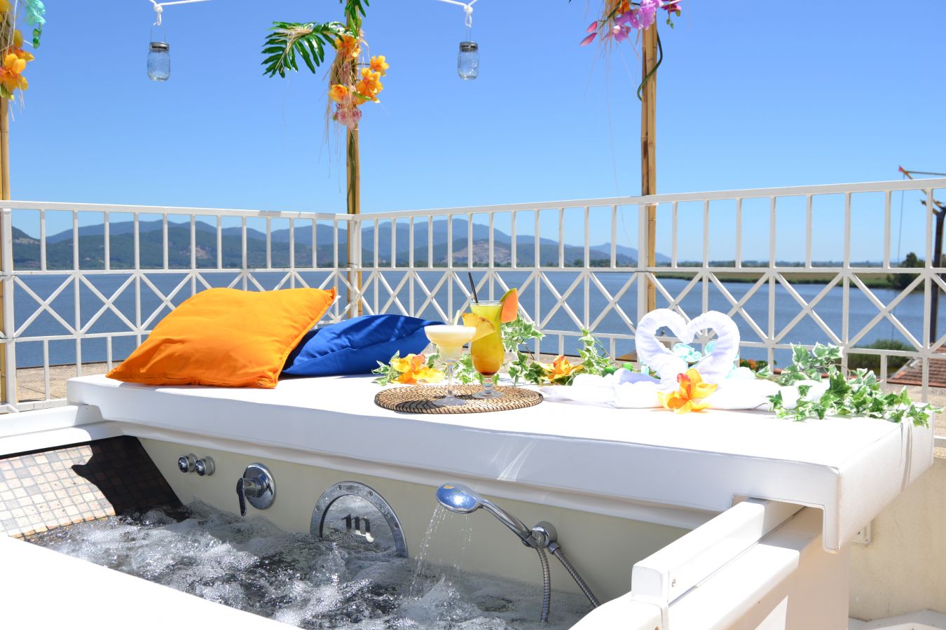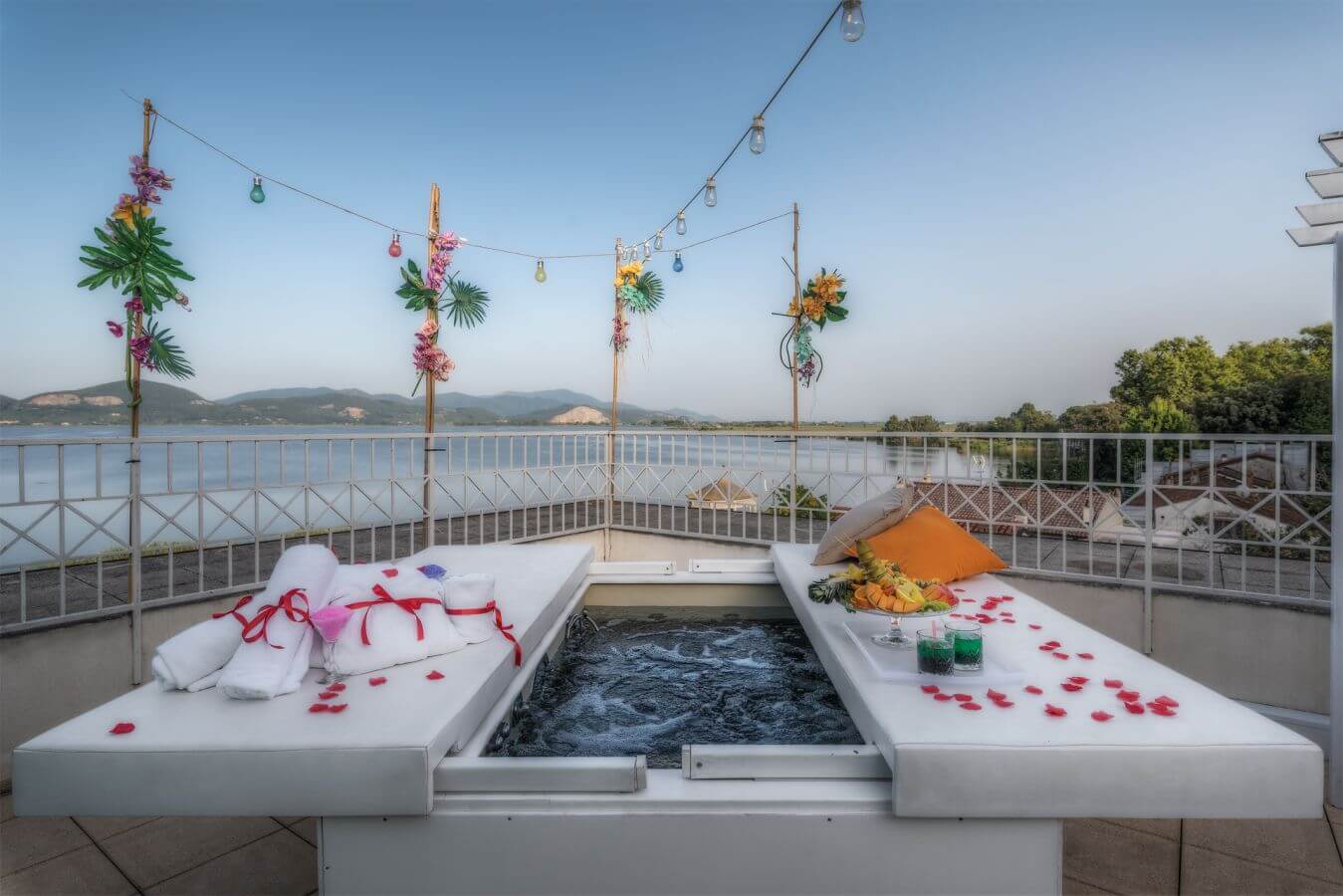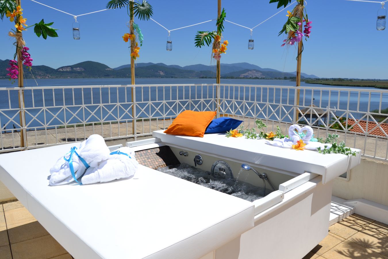 L’Oasi Wellness Tahiti si apre su un panorama mozzafiato, potrete ammirare il nostro meraviglioso lago con i colori del tramonto e farvi rapire dal suo manto stellato mentre vi rilassate nella vostra vasca idromassaggio.